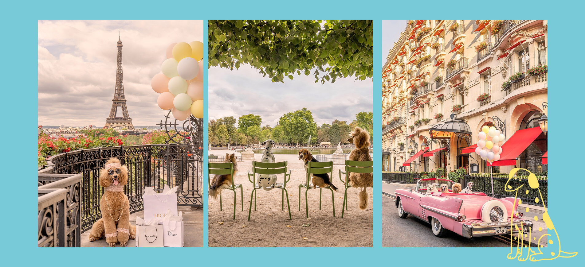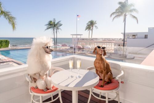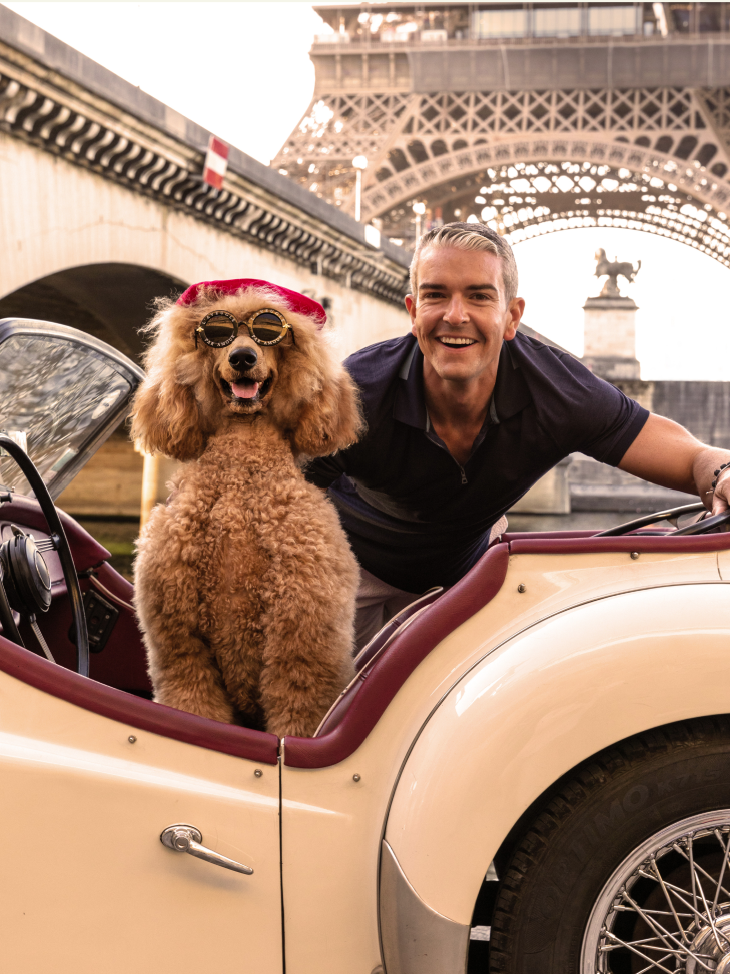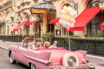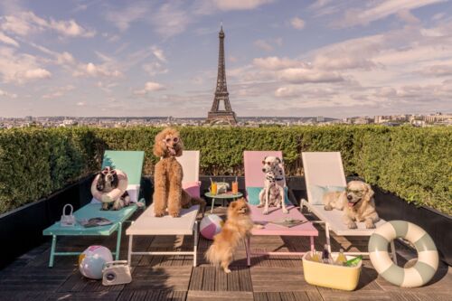 Our four-legged companions stay at the Plaza Athénée, the Colony in Palm Beach, and the Beverly Hills Hotel. They also surf in San Diego, relax at the foot of the slopes in Aspen, stroll through the streets of London, and sunbathe at the top of Top of the Rock in New York.
